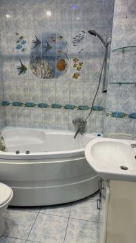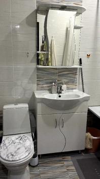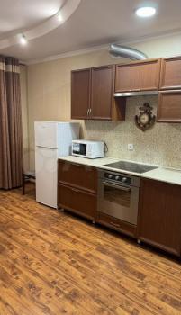 Кухня оснащена современной техникой: холодильник, варочная индукционная панель, духовой шкаф, встроенная микроволновка. Из кухни есть выход на застеклённую лоджию, где можно наслаждаться свежим воздухом. Ванная комната совмещённая, оформлена стильной плиткой и оснащена современной сантехникой.