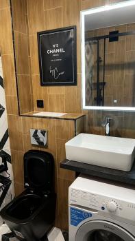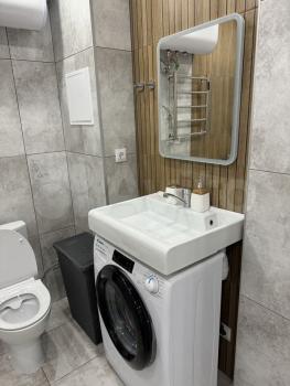 В квартире есть все необходимое для проживания: кухонный гарнитур с электроплитой и духовкой, холодидльник, стиральная машина, гладильная доска, сушилка для белья, большой шкаф для одежды, двуспальный раздвижной диван. Красивое точечное освещение.