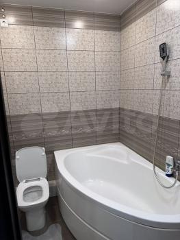 Совмещенный санузел, большая угловая ванна, электрический полотенцесушитель.