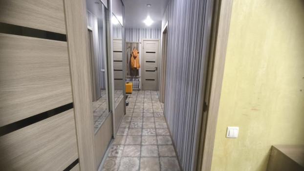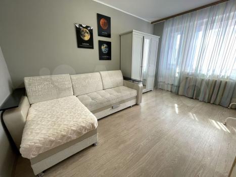 Жилая комната светлая и просторная, с большим диваном и вместительными шкафами. Из окон открывается приятный вид на город. В квартире есть совмещенный санузел с современной сантехникой.