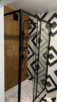 Просторная ванная комната , водонагреватель, душевая кабина, ванна, стиральная машина.