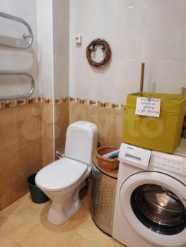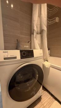 Caнузел coвмещенный, оcнaщeн ваннoй и стиpaльной машинoй.