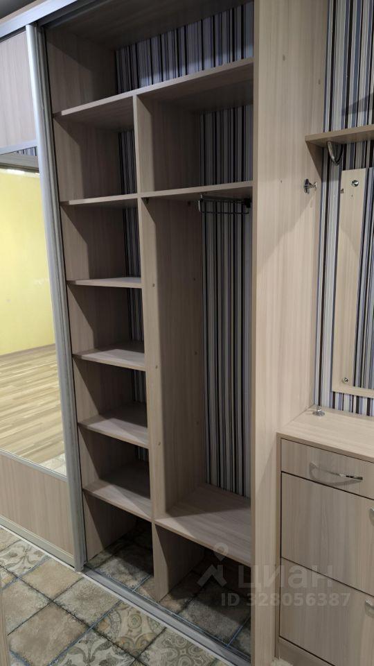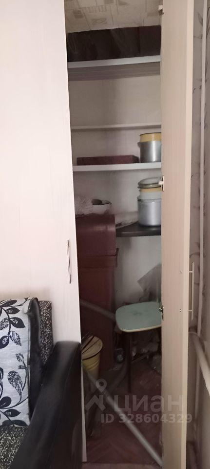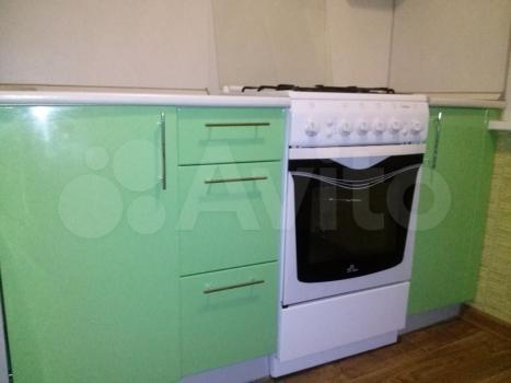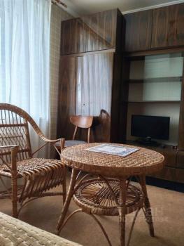 В комнате установлены шкафы для хранения вещей, диван и кресло (раскладываются). Санузел совмещённый, оснащён ванной. Кухня оборудована плитой и шкафами для хранения.