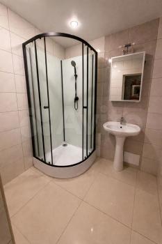Просторная ванная комната , водонагреватель, душевая кабина, ванна, стиральная машина.