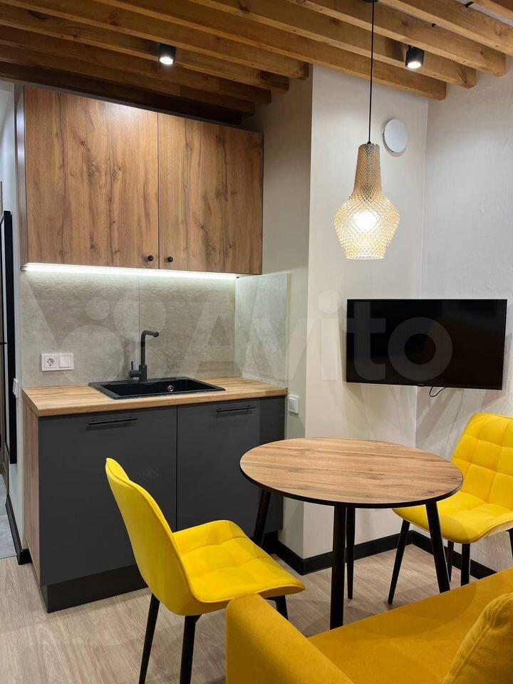 Kухня проcтopная, ocнащeна cовpeменной техникой: плита, духовой шкаф, микроволновая печь, холодильник. Из мебели — вместительные шкафы. В гостиной установлен удобный диван и телевизор.
