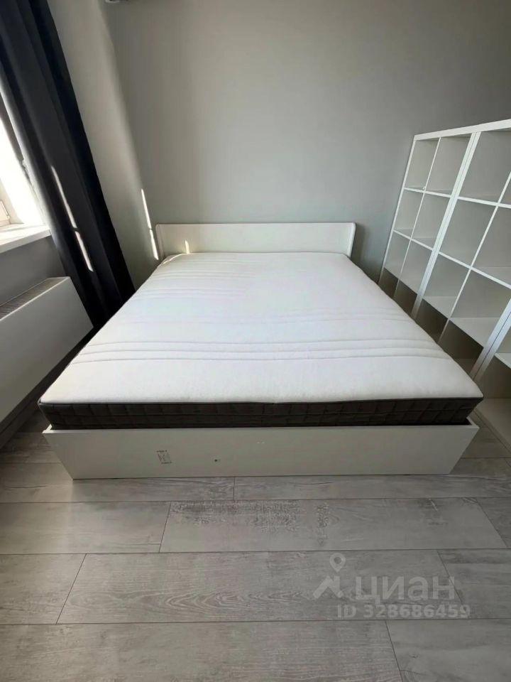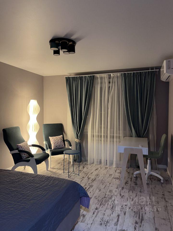 Из кухни есть выход на застекленную лоджию. Комната полностью укомплектована мебелью: двуспальная кровать с матрасом, прикроватная тумбочка, два удобных кресла со светильником и рабочий стол со стулом. Также имеется кондиционер.