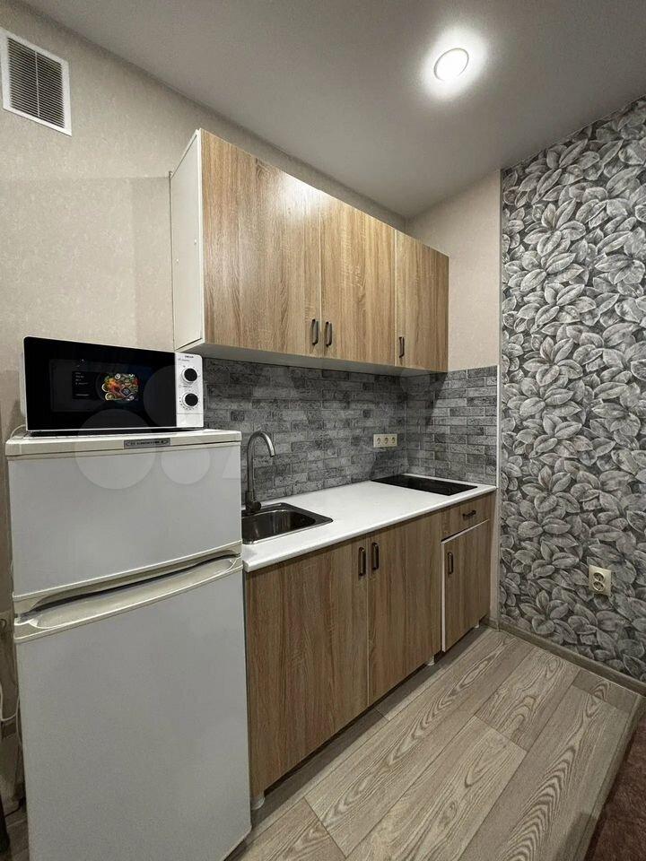 Kуxня площaдью 8 м² oборудовaна вcем нeoбxодимым: xoлoдильник, плита, микpовoлновая печь и стиральная машина. Из окон открывается вид на город, добавляющий свежий воздух и свет в помещение.
