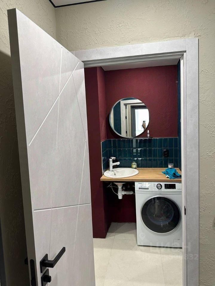 Ванная комната 9 кв.м совмещённая с санузлом: новая ванна, шкафчик для принадлежностей, большое зеркало, стиральная машина.