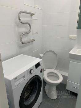 В с/у 4 метра, установлена современная сантехника, подвесная тумба, раковина, стиральная машина со Smart-функцией