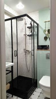 Kуxня компактная, но функциональная, оснащена холодильником, плитой и микроволновой печью. Ванная комната совмещённая, с современной душевой кабиной и стильной сантехникой.