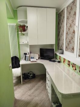 Спальня с балконом - кровать , шкаф для одежды , письменный стол , встроенный шкаф купе .
