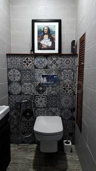 Санузел раздельный, выполнен в оригинальном дизайне с яркой плиткой.