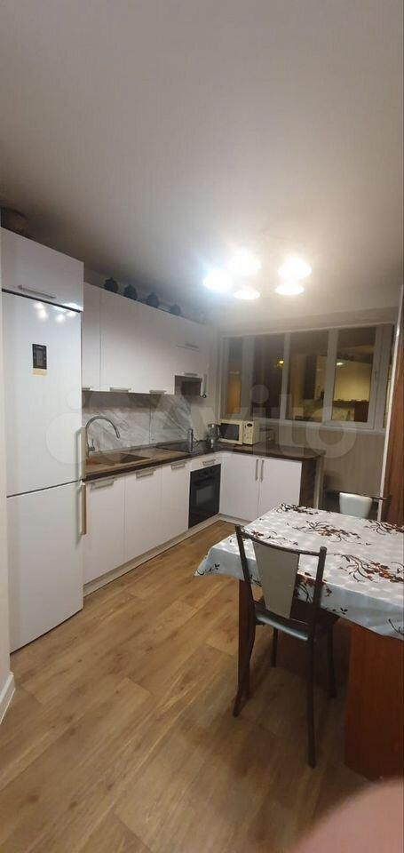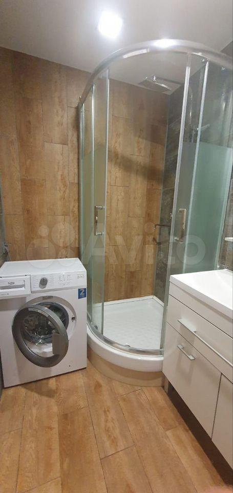 Кухня просторная, площадью 12 м², оборудована необходимой бытовой техникой, включая холодильник и стиральную машину. Из мебели — шкафы и обеденный стол. Ванная комната совмещена с санузлом и оснащена душевой кабиной.