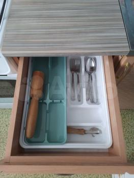 На кухне кухонный гарнитур , встраиваемая техника. Газовая панель, духовой шкаф , микроволновка, колонка. Стиральная машинка. Холодильник.