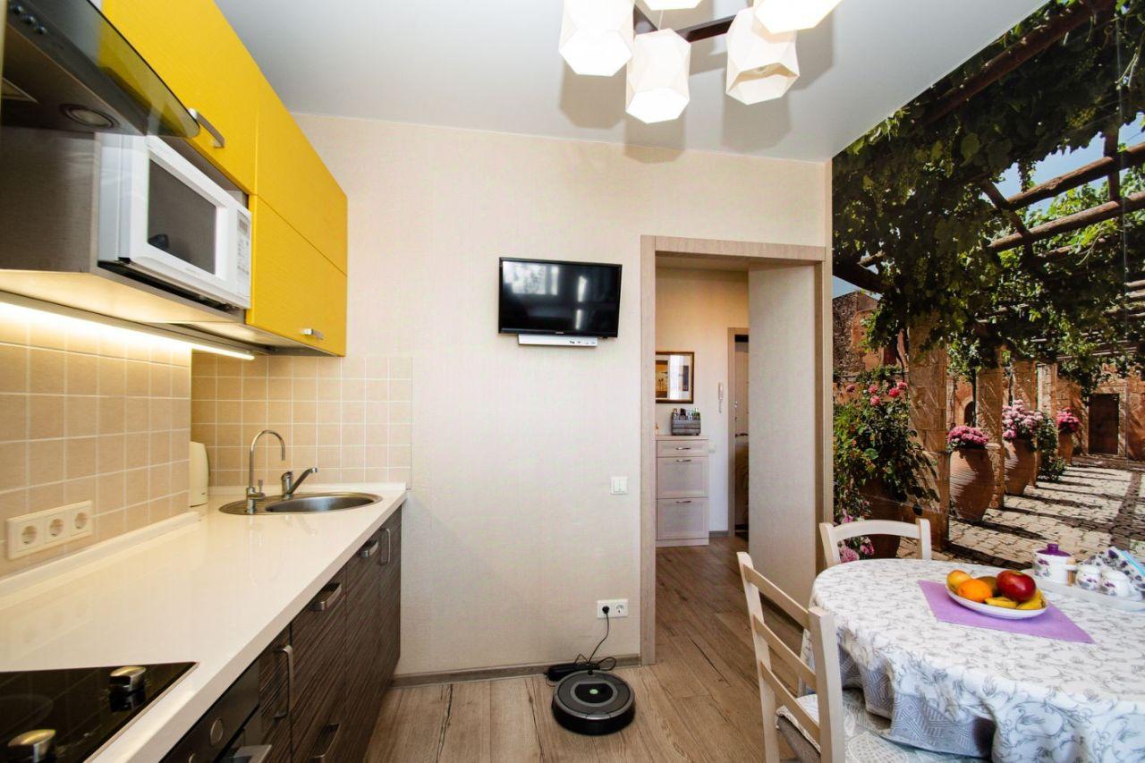 вся необходимая качественная кухонная техника (микроволновка духовой шкаф Bosh, смарт телевизор Android, чайник Redmond), теплый пол.