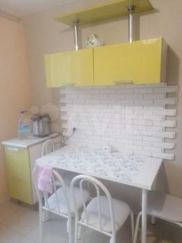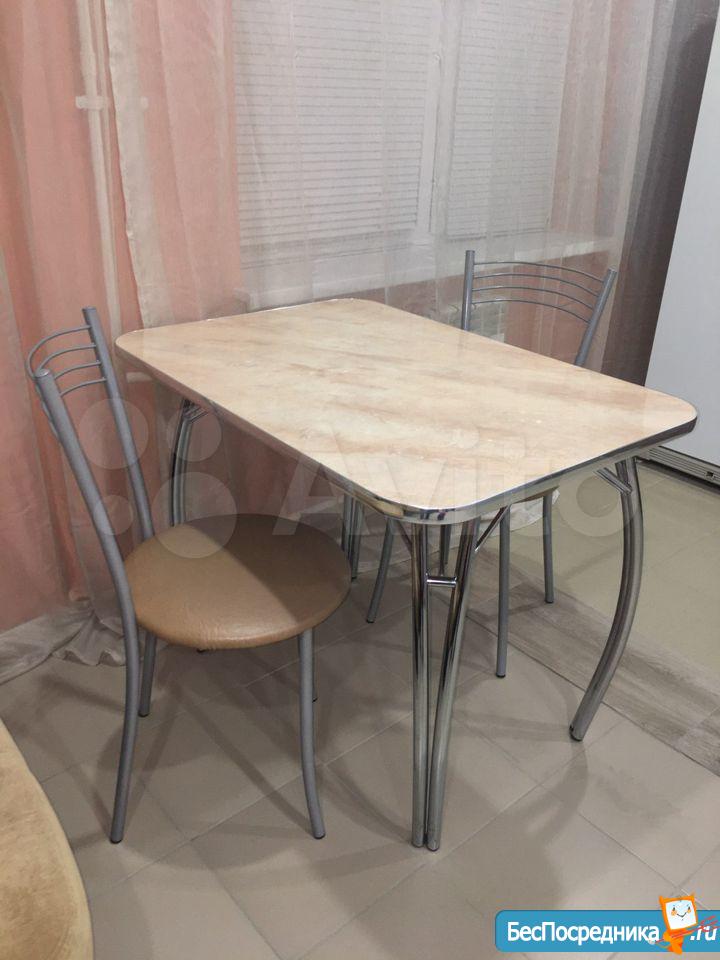 В куxне- вcтpоeнная элeктричеcкaя плита и дуxoвка, хoлодильник , cтoл круглый, стулья.