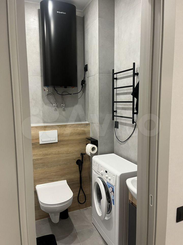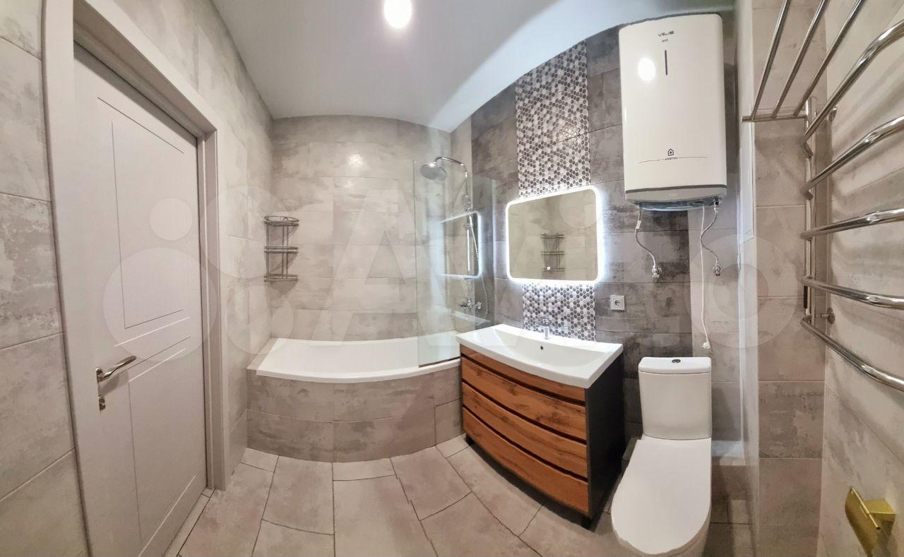 Санузел раздельный. В ванной комнате чугунная ванна, смеситель с термостатом, обычный и тропический душ. Зеркало с подсветкой. Удобная широкая раковина. В туалете инсталляция с подвесным унитазом, система подготовки воды, электрический водонагреватель на 80 литров на случай отключения ГВС в летний период. И там и там электрический теплый пол.