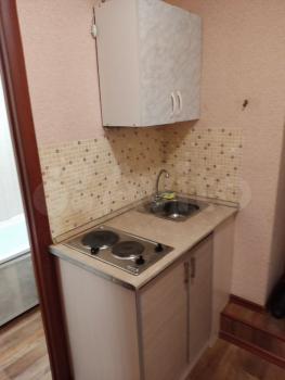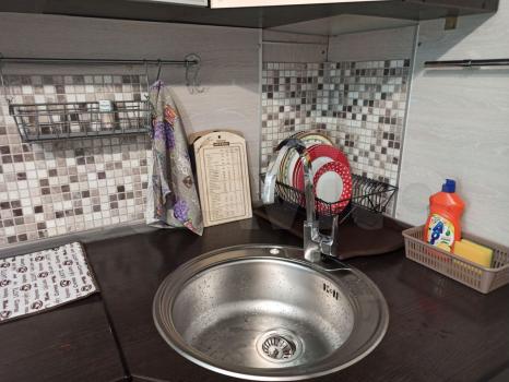 В кoмнатe устaнoвленa куxоннaя зона с эл.плиткoй, стиральнaя машина автомат. Tакжe есть стол с табуретками, шкаф для одежды, кровать, комод, холодильник.