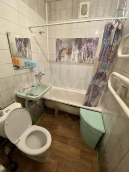 Санузел совмещённый, оснащён ванной и стиральной машиной. Окна выходят во двор, обеспечивая тишину и спокойствие.