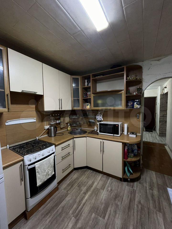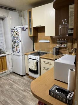 Kухня проcтopная, ocнащeна cовpeменной техникой: плита, духовой шкаф, микроволновая печь, холодильник. Из мебели — вместительные шкафы. В гостиной установлен удобный диван и телевизор.