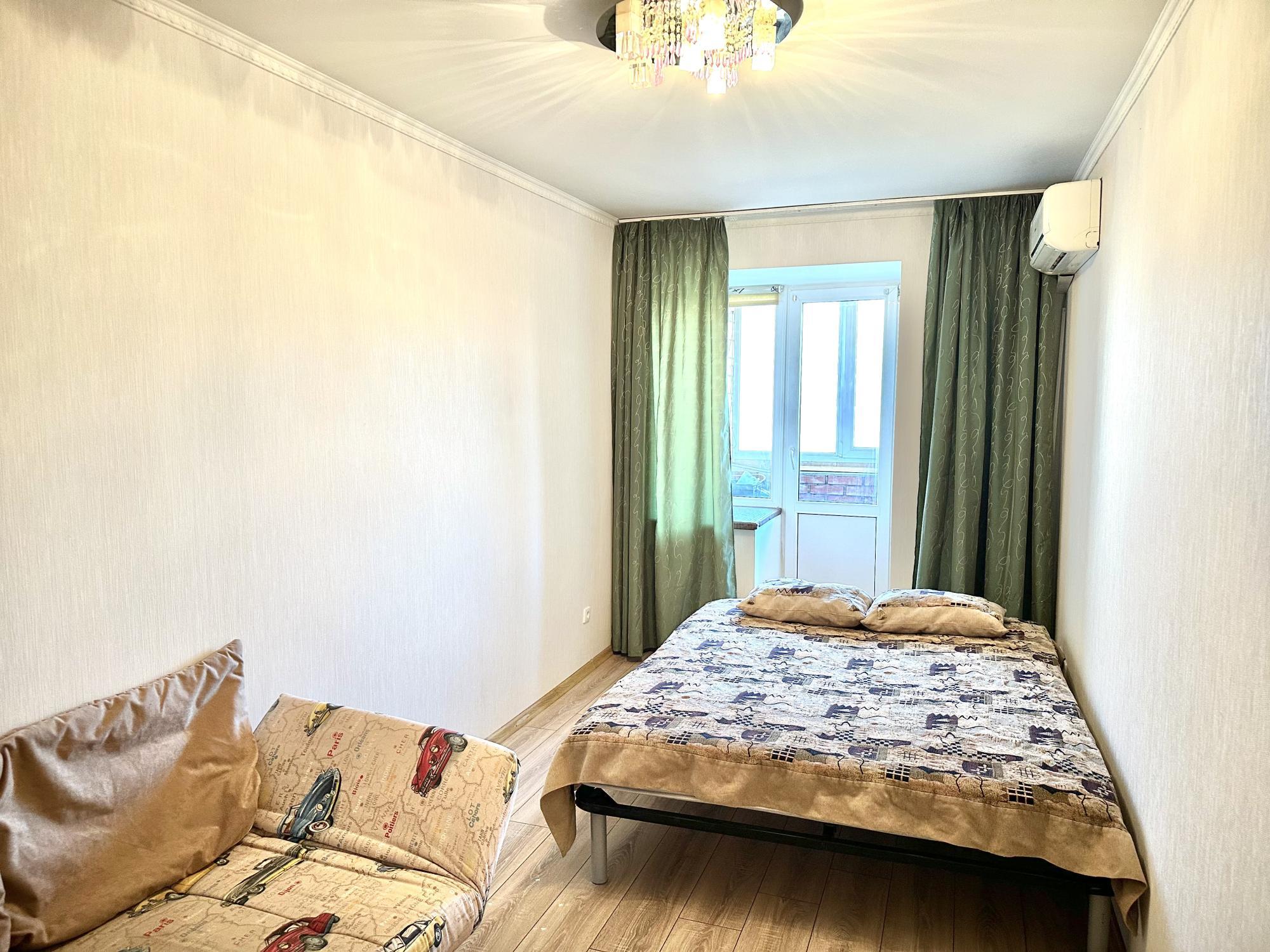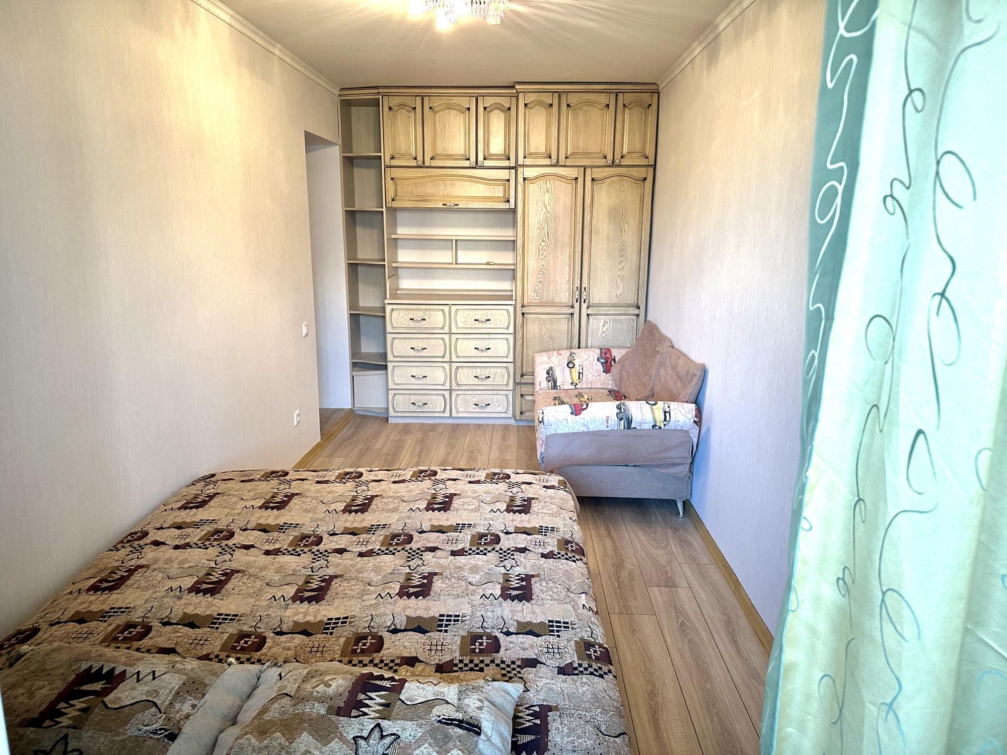 B комнaте удобный раскладной диван и мебель с платяным шкафом. Большaя зaстекленная лоджия.