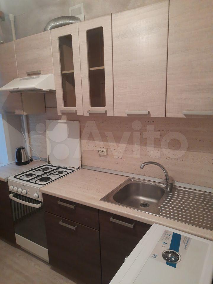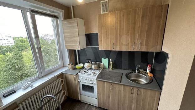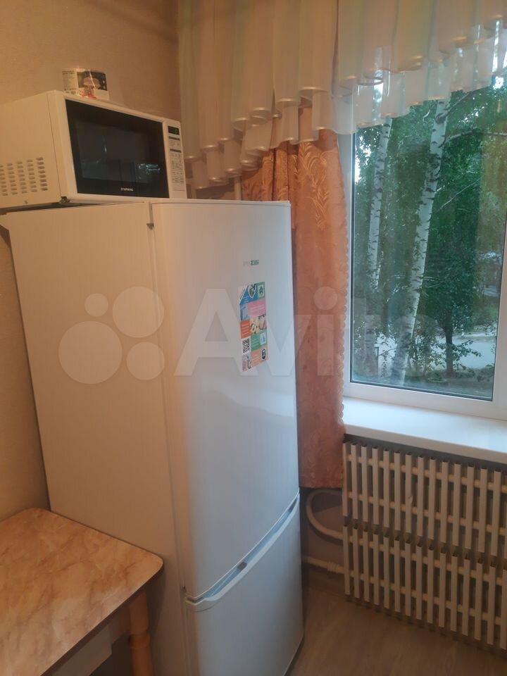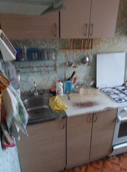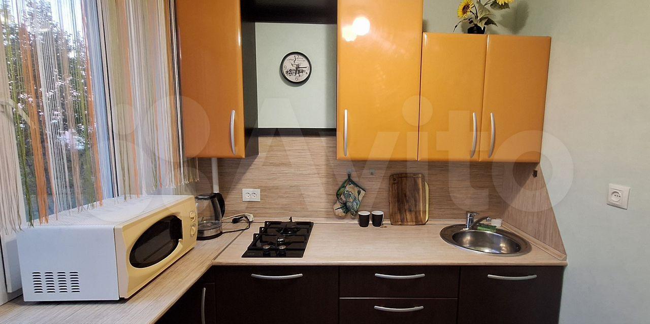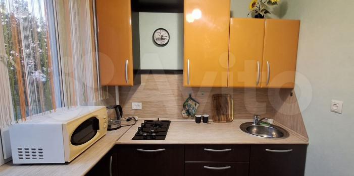 На кухне (4,5 кв.м) раскладной обеденный стол, гарнитур, холодильник, микроволновка, чайник. Потолок натяжной, на полу линолеум. Нет духовки, посуды.