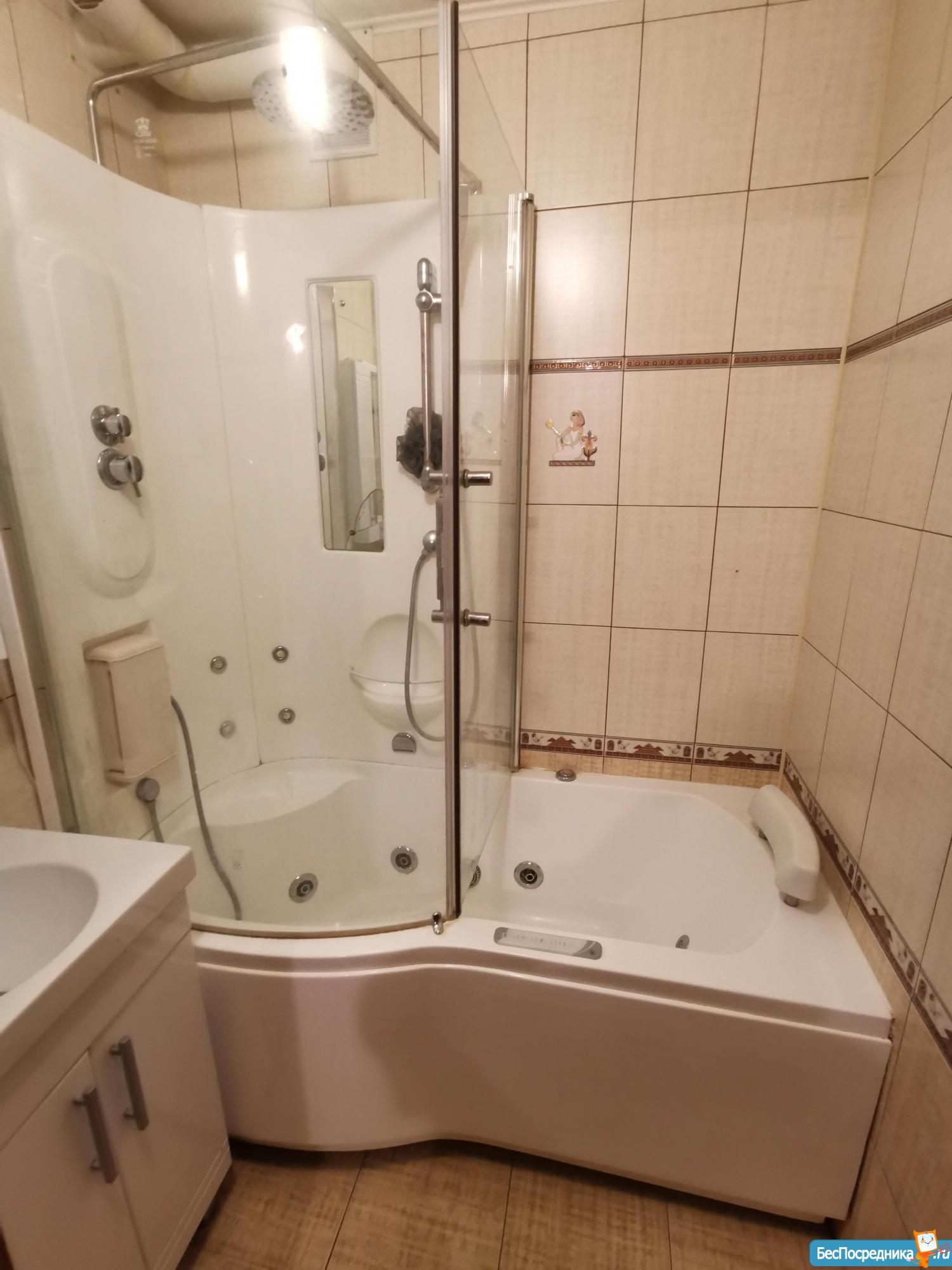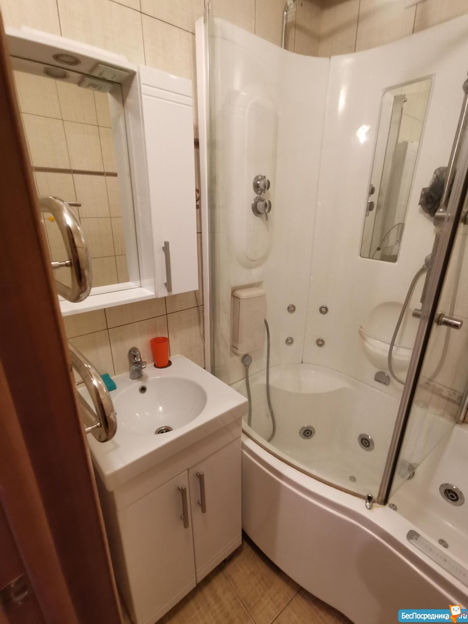 Бытовая техника: газовая плита с духовкой, стиральная машина, холодильник, микроволновка, электический чайник, вытяжка, ванная с душевой кабиной, кухонный телевизор. Установлен кондиционер и водонагреватель, проведён кабель для ТВ/интернета.