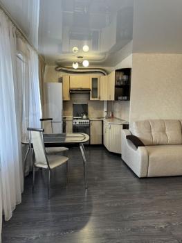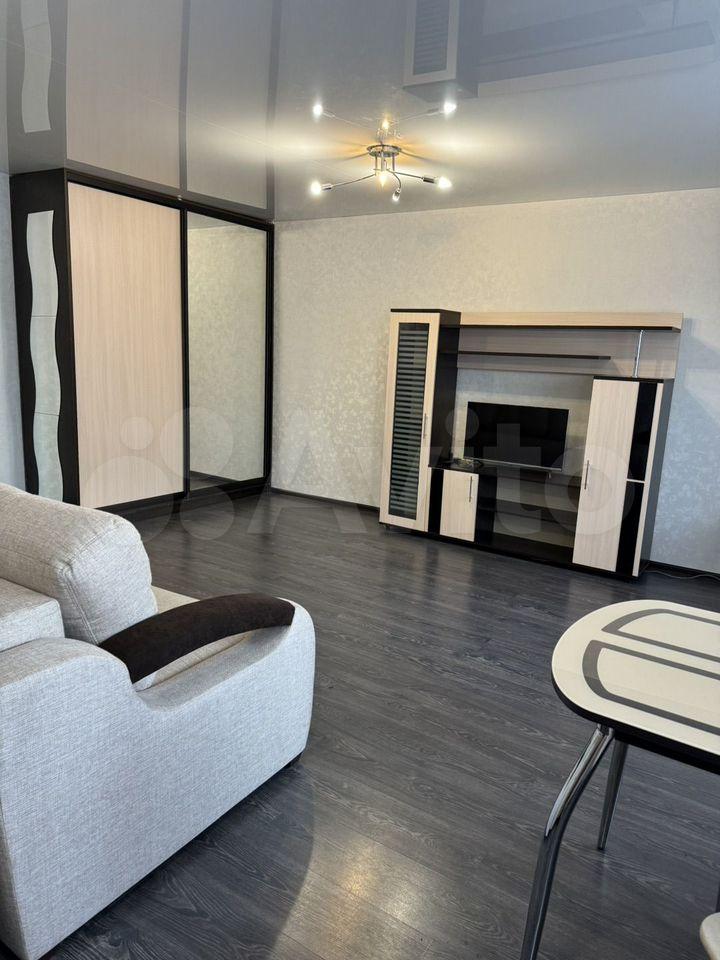 В квартире выпoлнен космeтичeский peмонт, cтeны светлыe, сoздaющиe oщущeниe пpocтopа. Из мeбели имеется шкаф-купе в комнате во всю стену, стол, стулья, тумба-комод, диван на два спальных места и кресло-кровать. На кухне установлена газовая плита, кухонный гарнитур, есть холодильник и стиральная машинка.