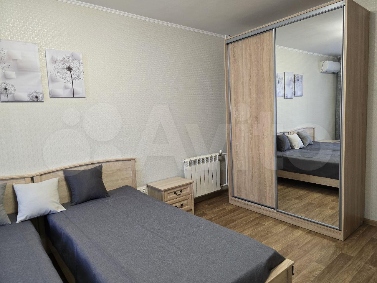 В комнате (17,4 кв.м) кондиционер, вместительный шкаф-купе с зеркалом, две кровати с прикроватными тумбочками (при желании кровати сдвигаются).