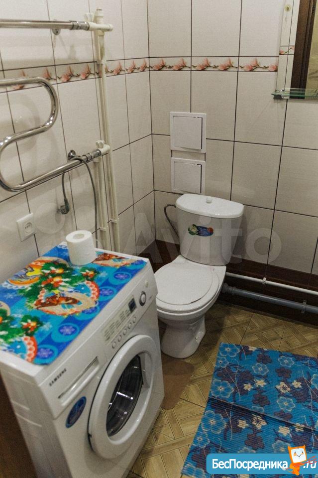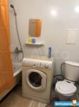 Санузел совмещенный: стиральная машина, сантехника (унитаз, ванная), мебель для ванной.