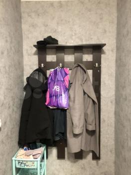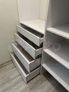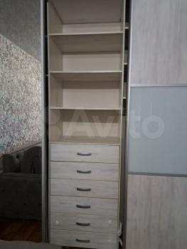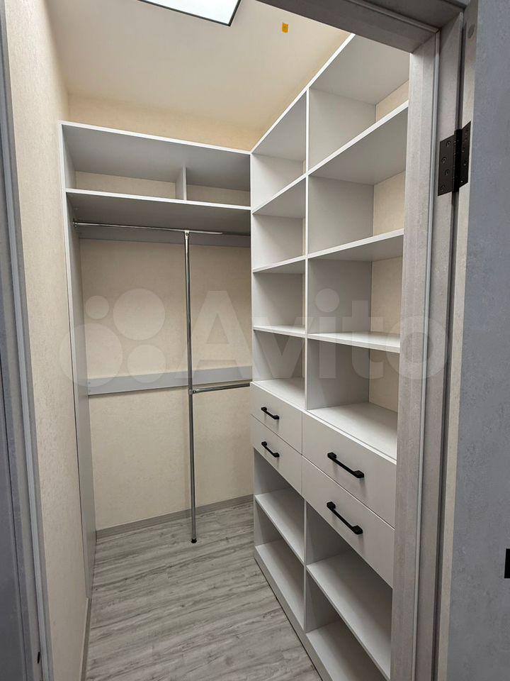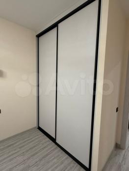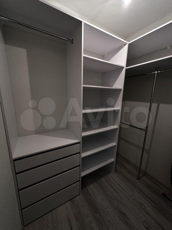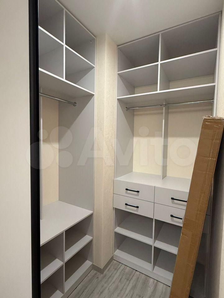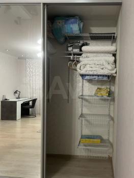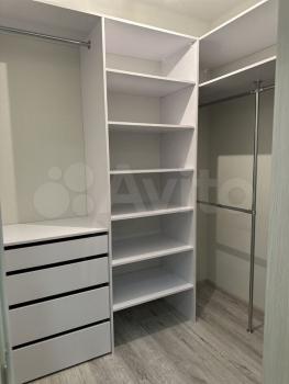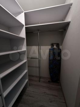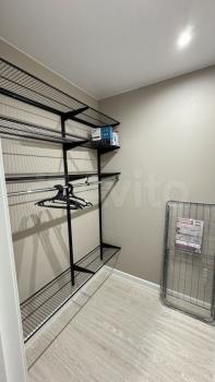 В квартире две большие гардеробные: одна в коридоре, для верхней одежды, другая в спальне. Из мебели двухспальная кровать, диван, тумбы.