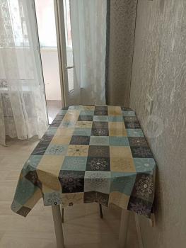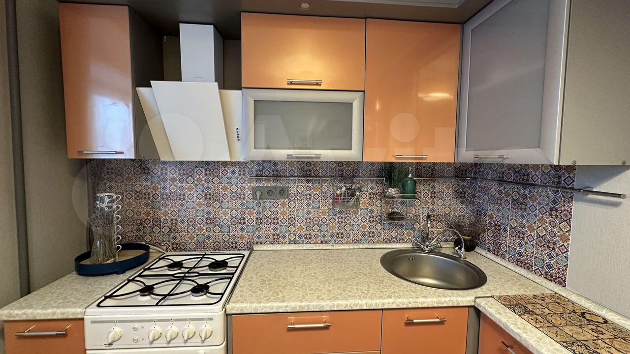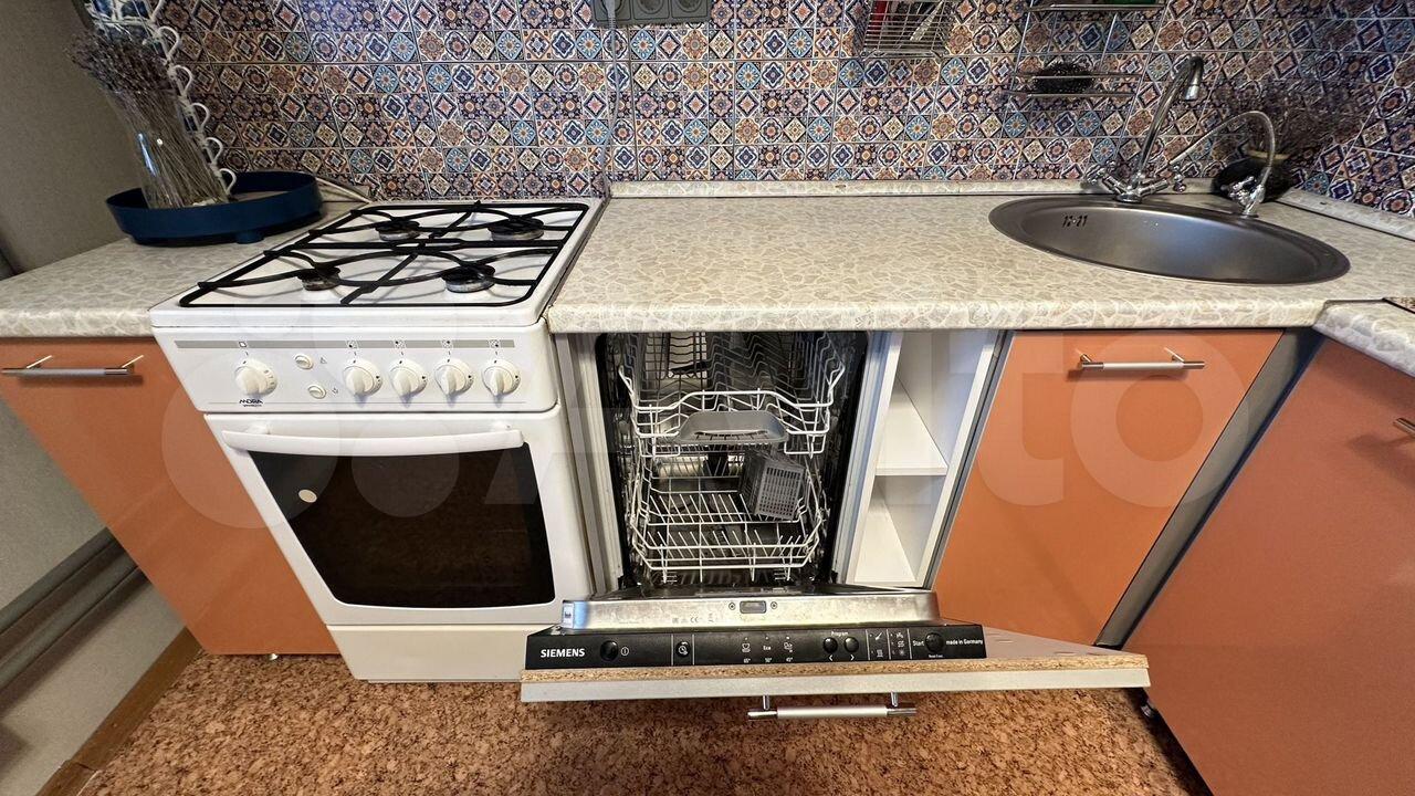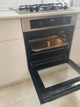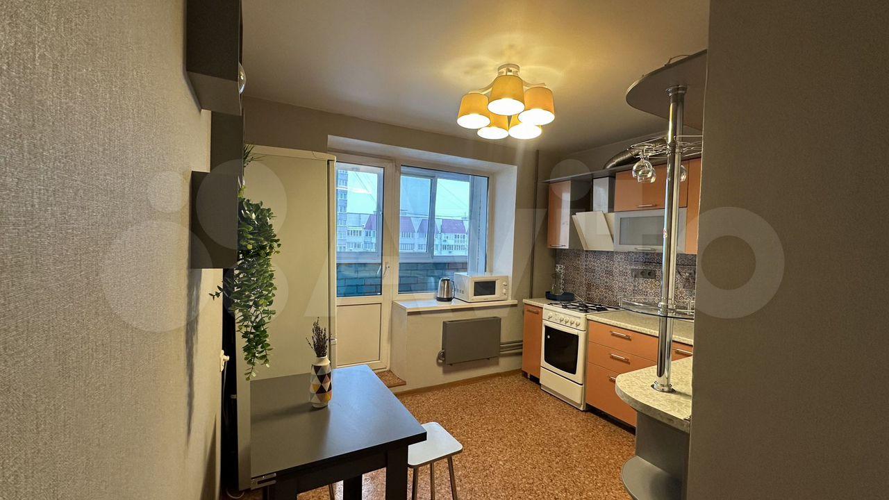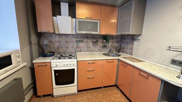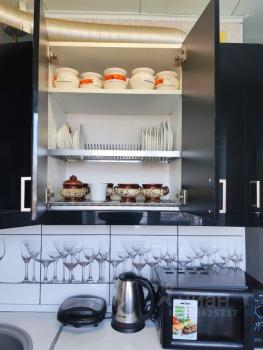 Кухня оборудована всем необходимым — кухонный гарнитур, мойка, плита, духовой шкаф, холодильник, микроволновая печь. Также присутствует выход на лоджию, на которой есть место для хранения кухонной утвари.