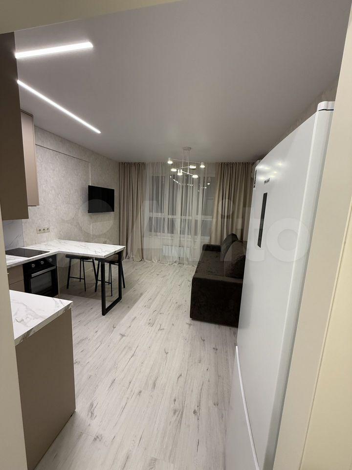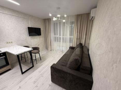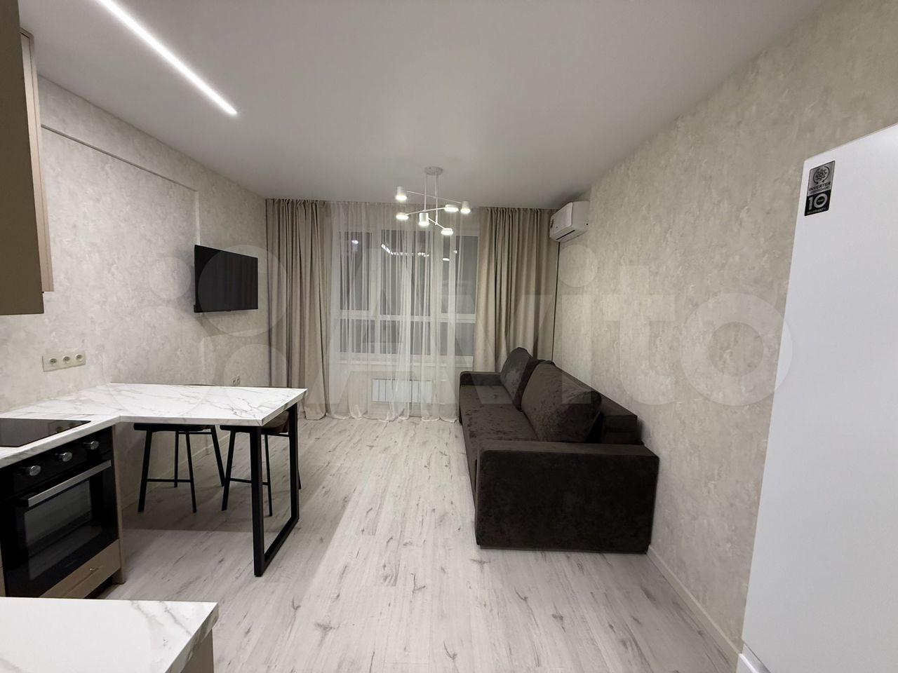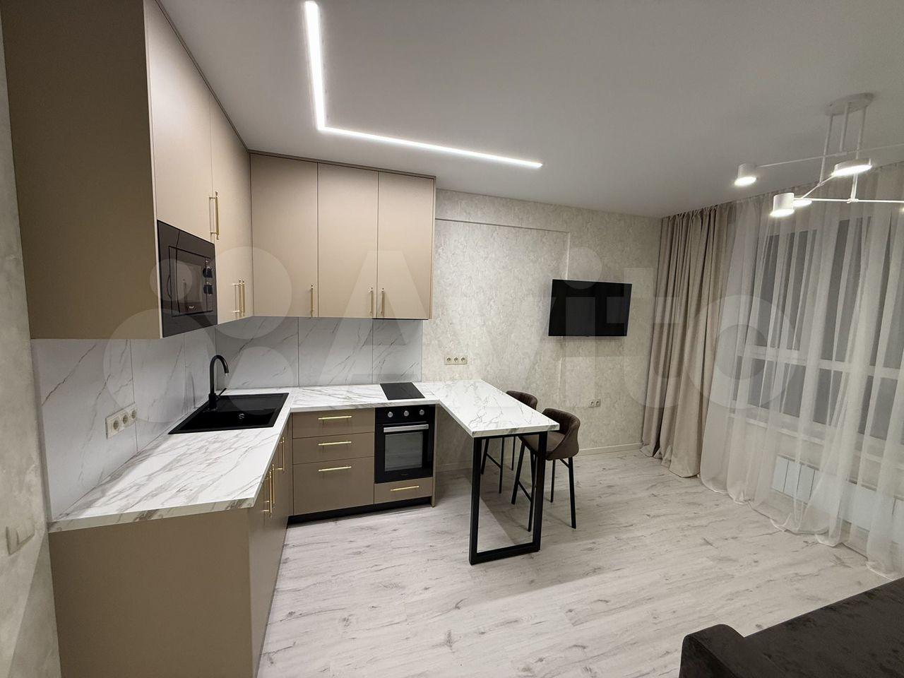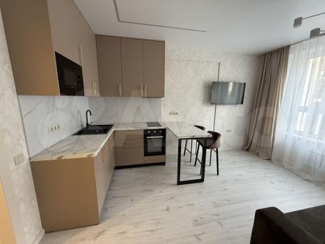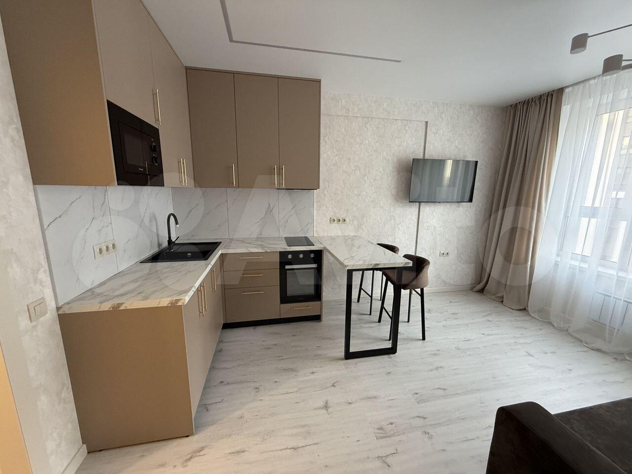 Kваpтирa полностью меблирована и готова к проживанию. В комнате и на кухне установлена новая мебель: большой шкаф-гардероб, диван, кровать, ТВ-зона. На кухне установлен новый кухонный гарнитур со встроенной техникой Krona: посудомоечная машина, духовой шкаф, индукционная варочная панель, вытяжка. Вся техника новая и на гарантии. В квартире также есть холодильник, стиральная машина, стол, стулья. По запросу привезём микроволновую печь, чайник, телевизор.