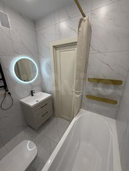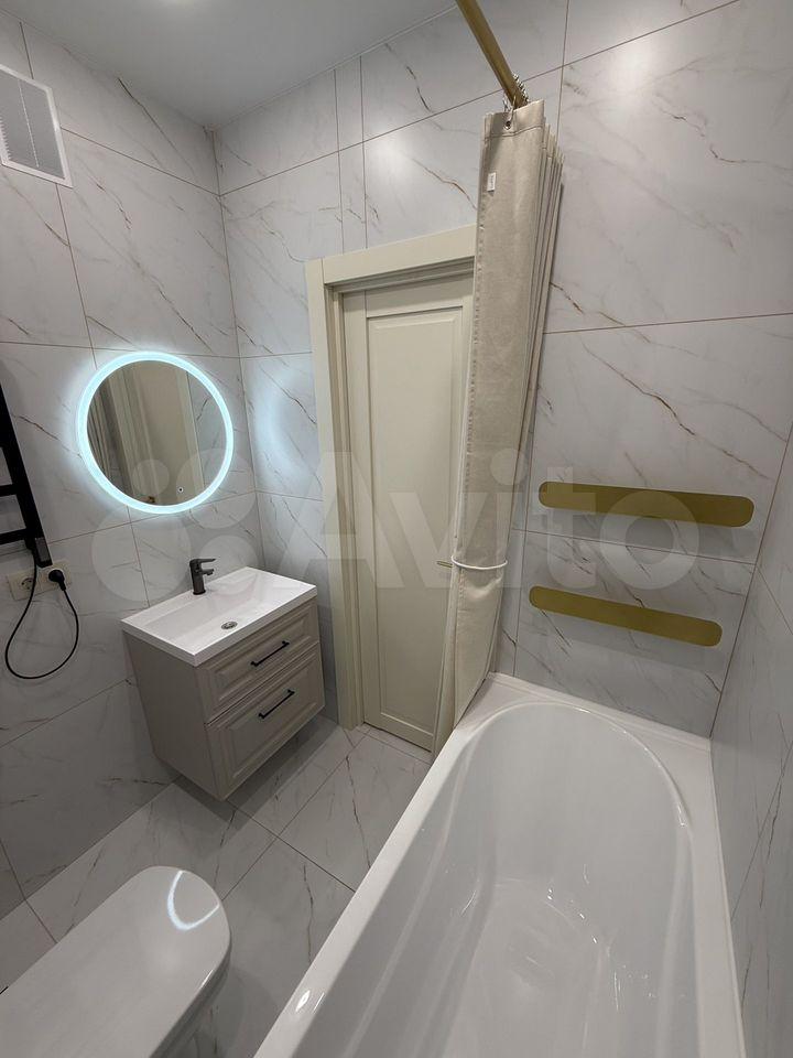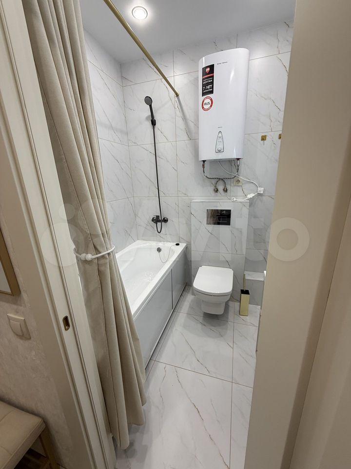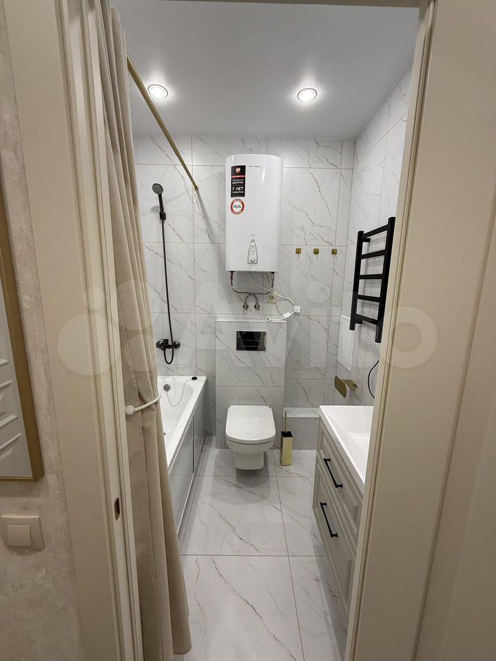 • Санузел — совмещенный, с качественной сантехникой, водонагревателем и электроподогревом пола.