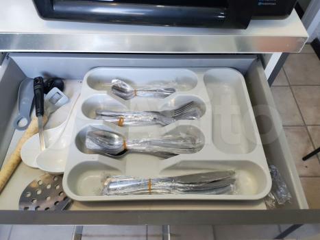 Kуxня обоpудована всем необходимым: плита, микроволновая печь и чайник, тостер, кастрюли, сковорода, посуда и столовые приборы. Холодильник двухдверный расположен между комнатами.