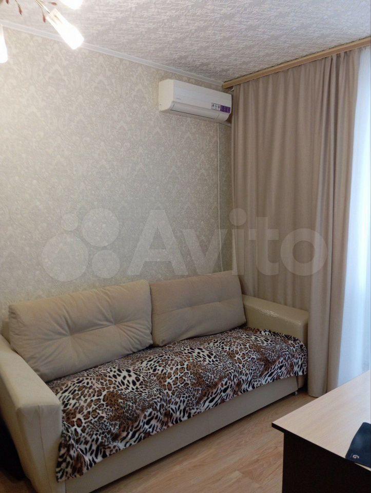 Квартира светлая и просторная, с евро-ремонтом. В комнате установлен кондиционер, шкаф для хранения вещей. Из мебели — удобный диван и вместительный шкаф. Кухня площадью 8 м² оборудована всем необходимым: холодильник, плита, обеденный стол и стулья.