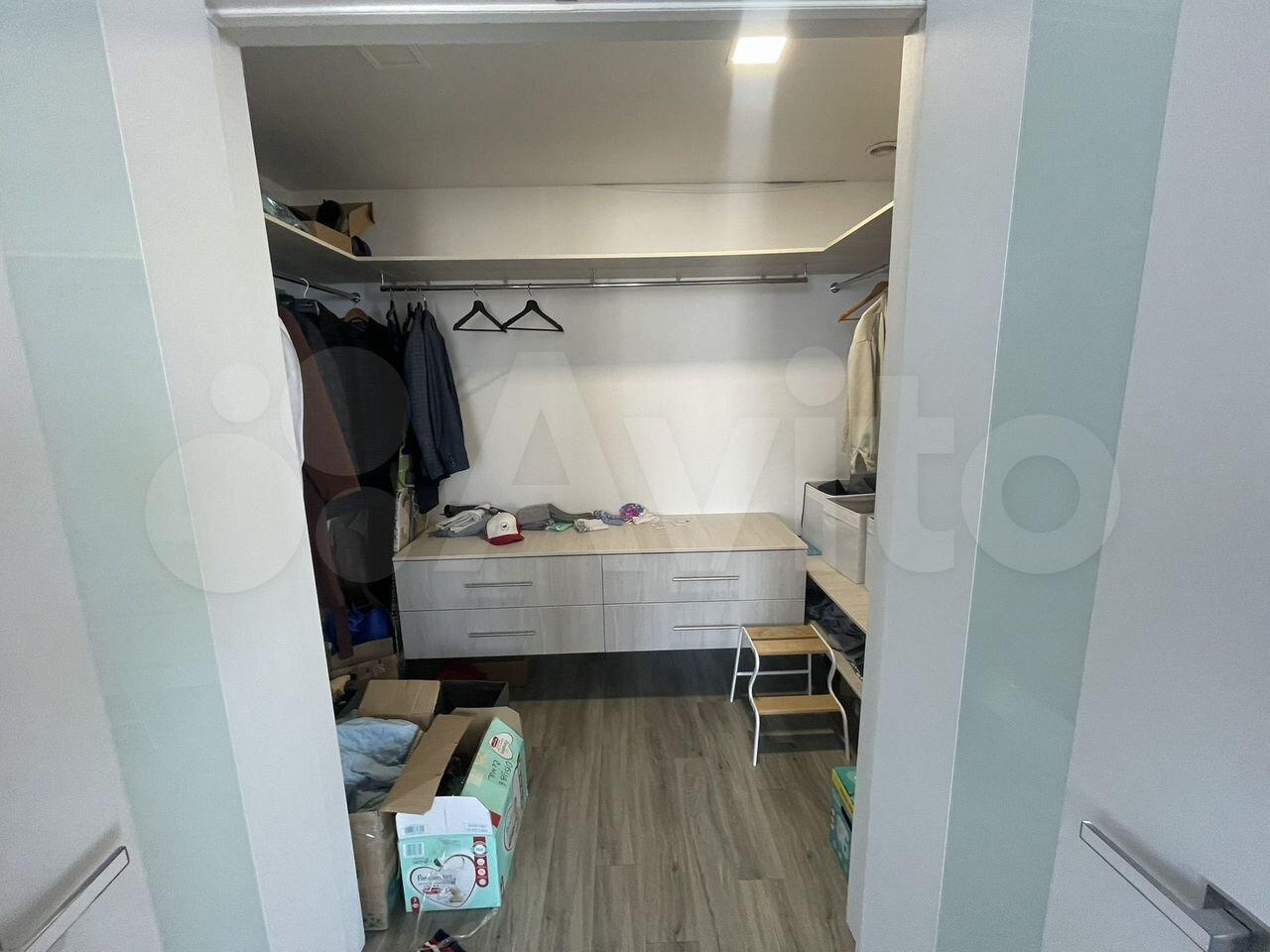 В гостиной установлен большой диван и телевизор, а также есть гардеробная комната для хранения вещей. Из окон открывается вид на город, создавая атмосферу уюта и спокойствия.