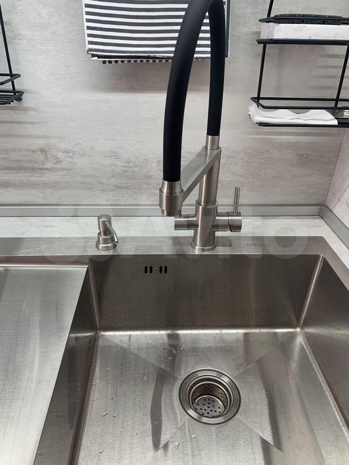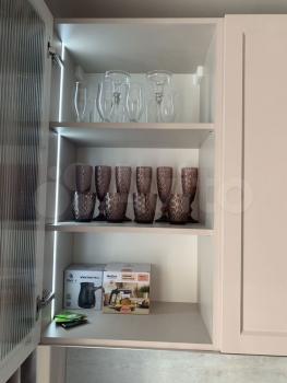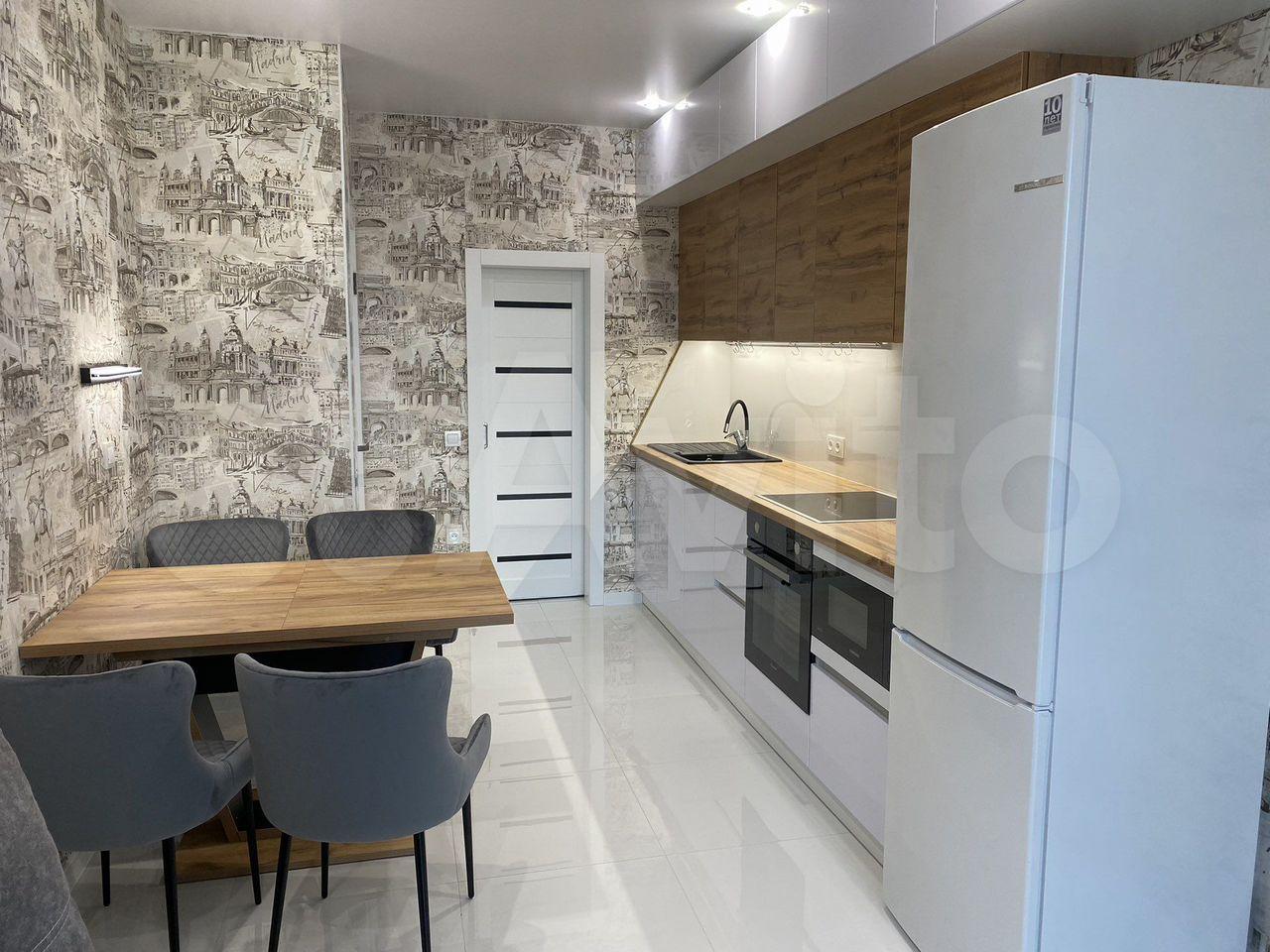 На кухне холодильник, индукционная варочная панель, микроволновая печь, духовой шкаф, вытяжка, электрический чайник.