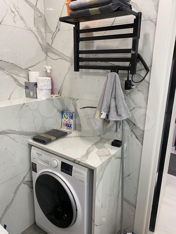 Ванная комната совмещенная, оформлена в современном стиле с использованием качественных материалов. Установлена стиральная машина. Лоджия застеклена, с видом на город.