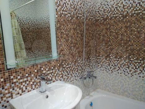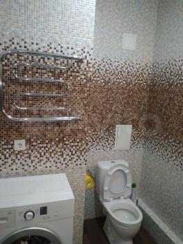 Санузел совмещенный, оформлен плиткой под дерево, установлена современная сантехника. Лоджия застеклена, что позволяет использовать ее как дополнительное пространство.