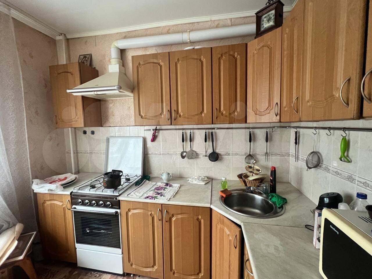 Кухня оборудована всем необходимым — кухонный гарнитур, мойка, плита, духовой шкаф, холодильник, микроволновая печь. Также присутствует выход на лоджию, на которой есть место для хранения кухонной утвари.